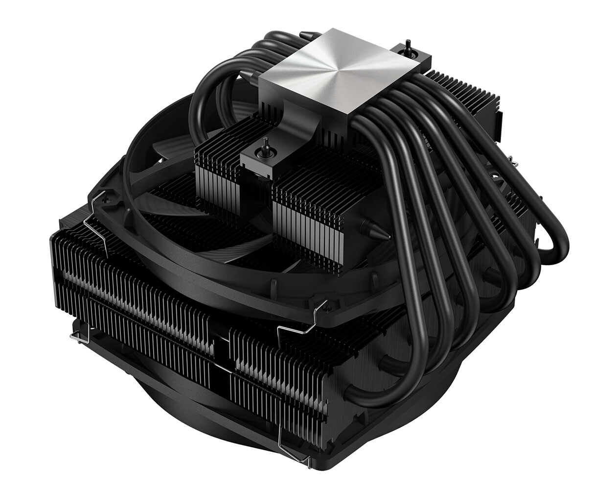 This cooler features a black color scheme that is continued through both 135 mm fans mounted to the top and the bottom of the heatsink. It features a dual heatsink design and uses six high-performance copper heat pipes, which offer outstanding cooling performance for both overclocked CPUs. This CPU cooler also cools the surrounding motherboard components, which allows for fast and reliable cooling performance. It also features a brushed aluminum cover which gives this high-end cooler a unique touch of elegance and makes it look even better for your next gaming or home office computer.
