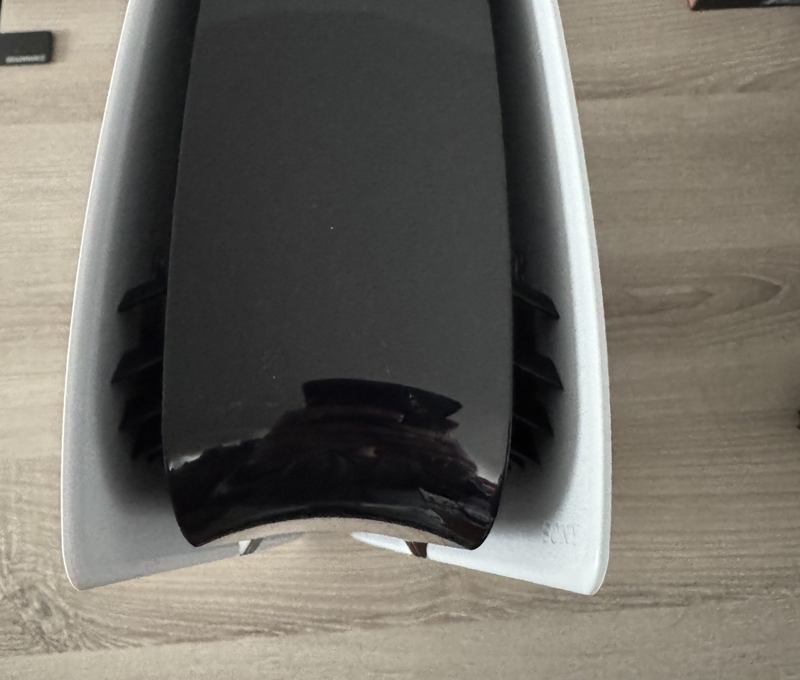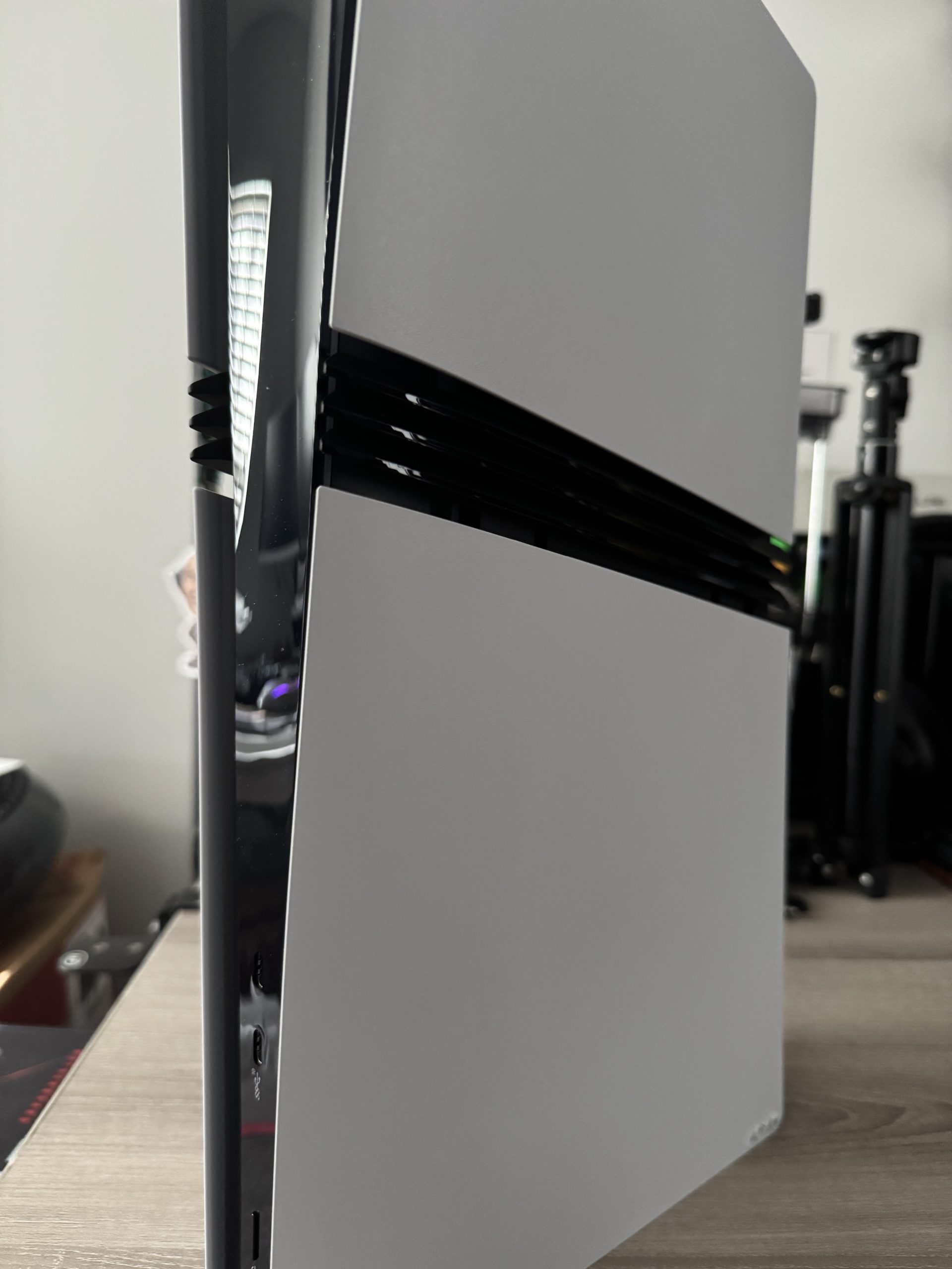 This time, Sony’s version of a console stand is a bit of an anomaly with the PlayStation 5 Pro. For a console that boasts improved stability for gaming, the console itself is far less stable. Apply any amount of pressure to either side of the console, and it rocks to either side. I suspect laying the console flat was intended to be more with the optional disc drive attached as the console only makes contact with the surface it’s on at three points: the two plastic stands and the back left corner adjacent to the AC port. I don’t yet have the disc drive attachment in the office, so I can’t speak confidently about the stability of the assembled product. Sony did include a vertical stand along with the console for review purposes, which was easy to install and kept the console from toppling over, but I did have to remove it when taking the console with me for a three-day business training seminar (not even job training is going to keep me from doing my daily challenges in Black Ops 6).