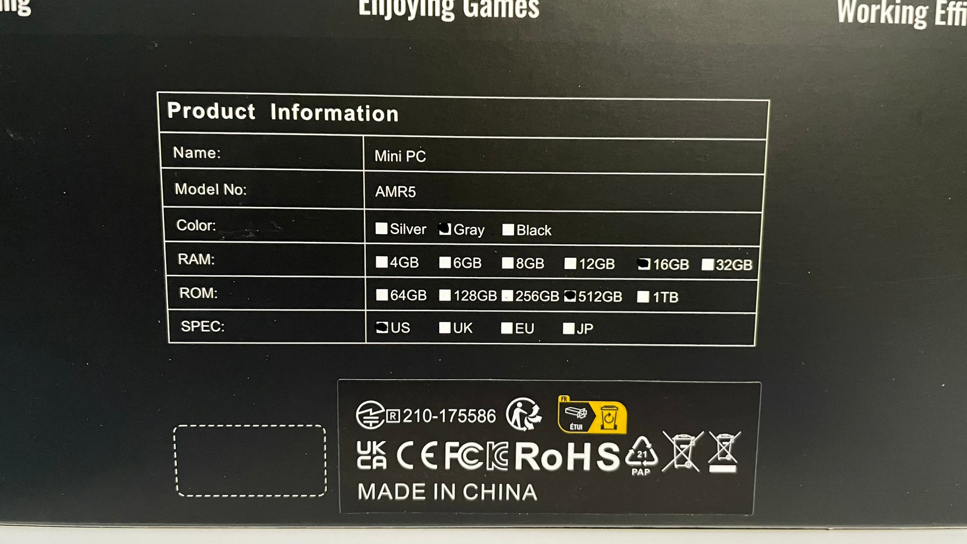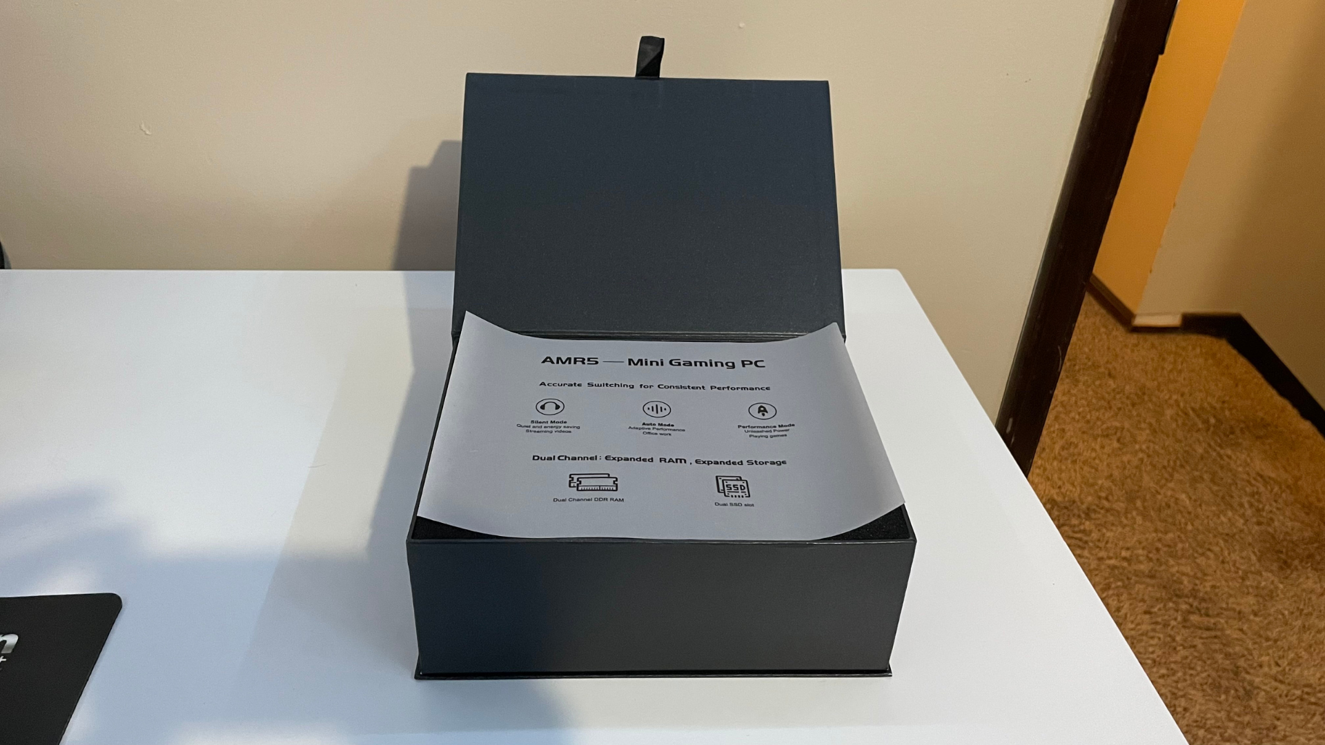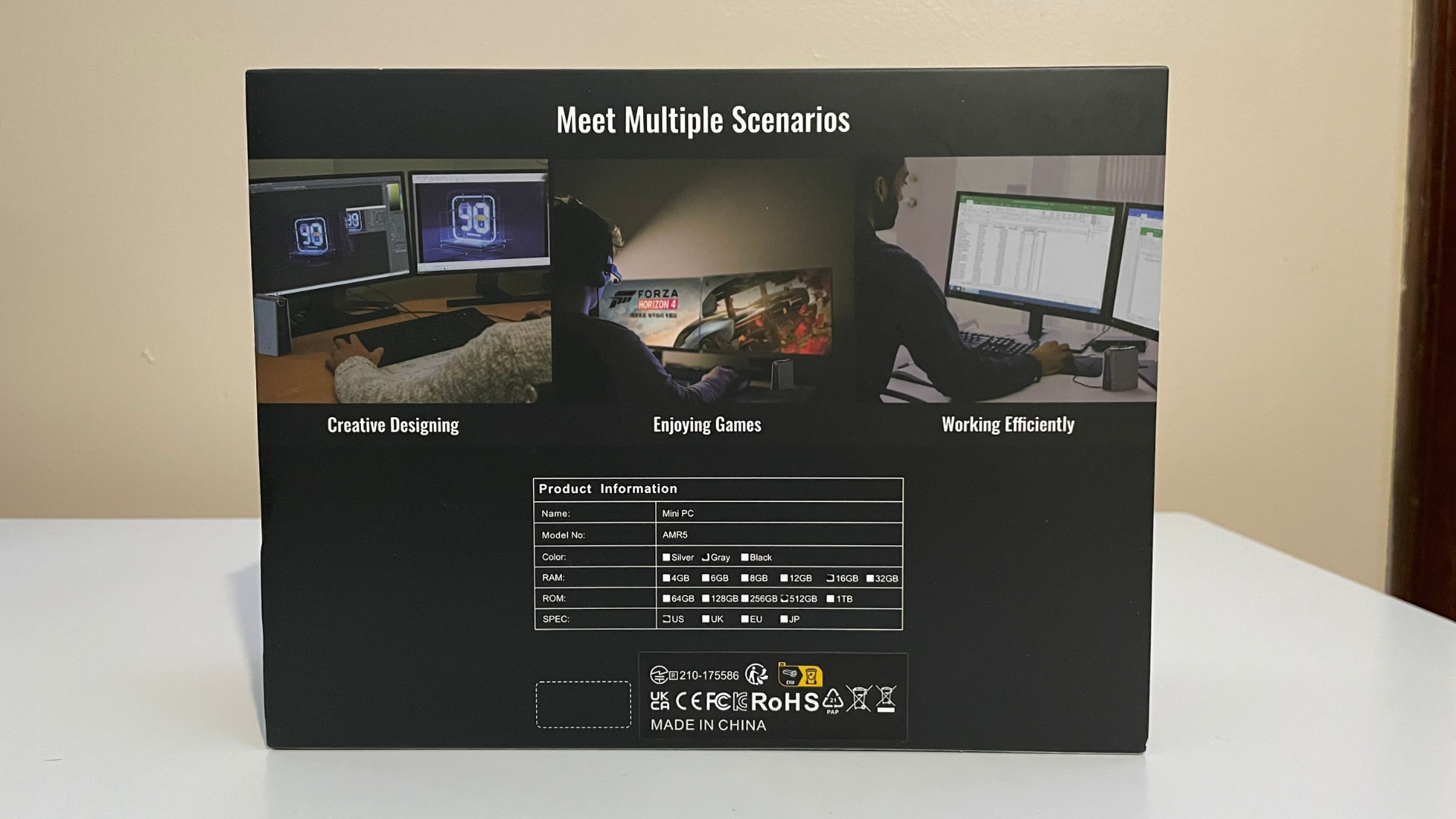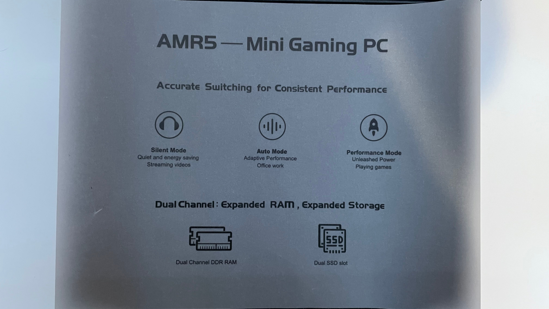 The AMR5 Mini Gaming PC comes in a smooth black box with the product card sleeve surrounding it. You can see the 3/4th view of the system next to the product name and brand logo. The back of the package shows that you can design, play games, and multitask for work, along with product information.
