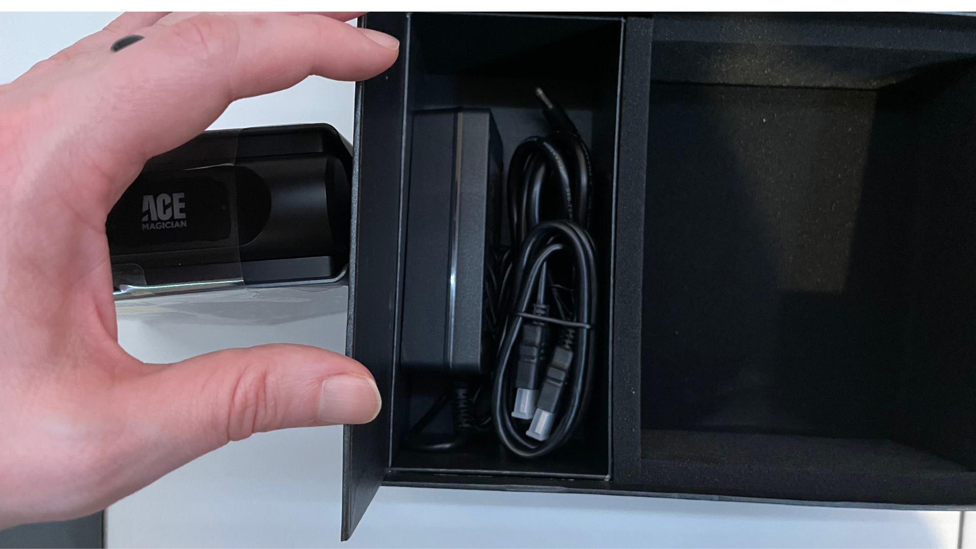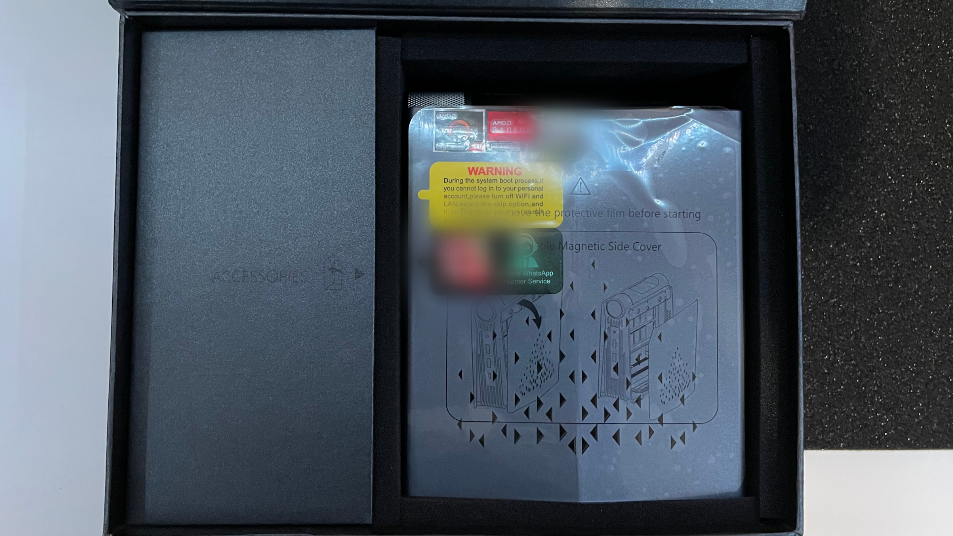 Once we remove the foam layer, we can see the AMR5 Mini Gaming PC wrapped in protective plastic, with a box to the left of the PC that will house the accessories. Everything is neatly packed and ready for assembly.