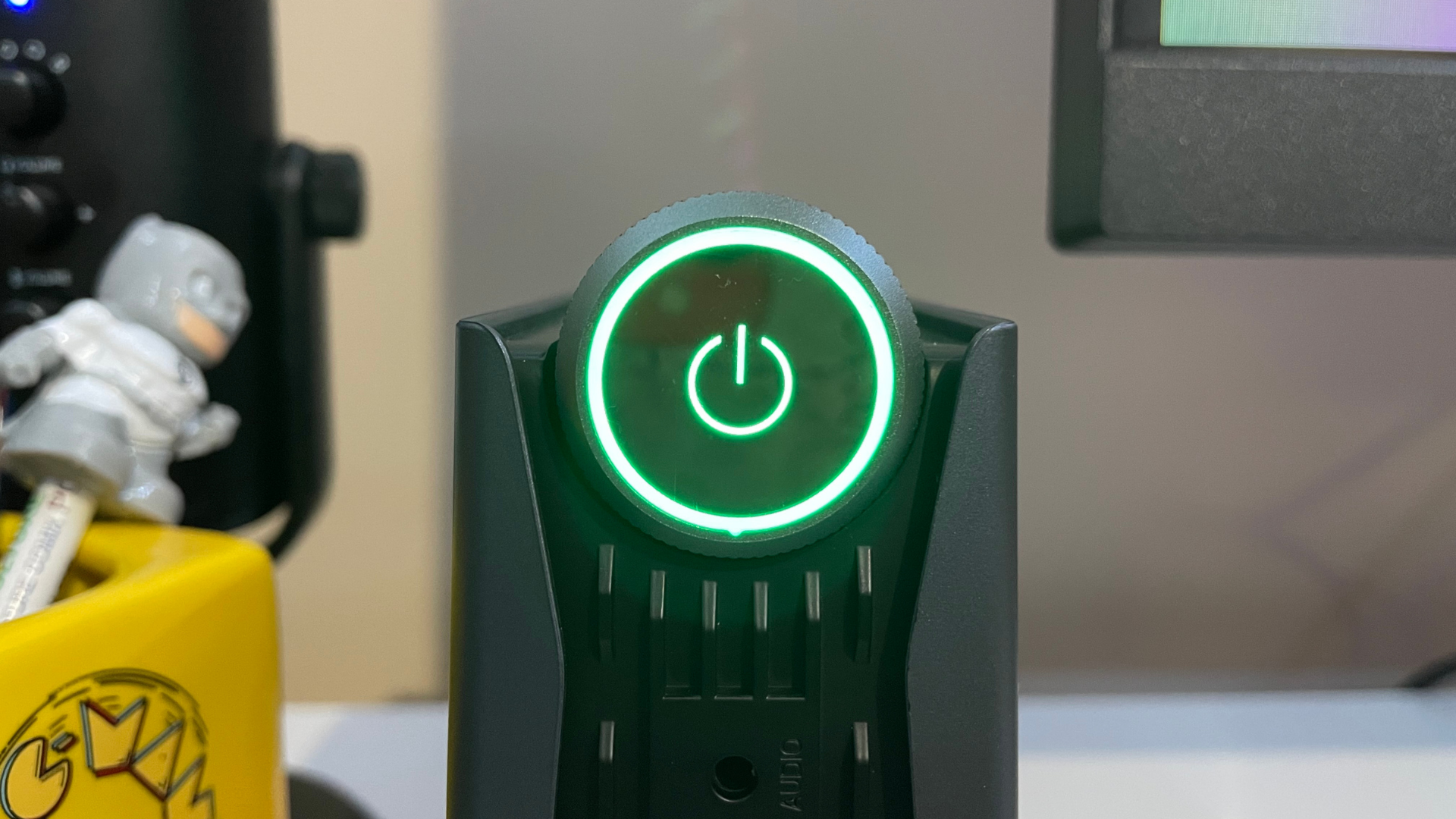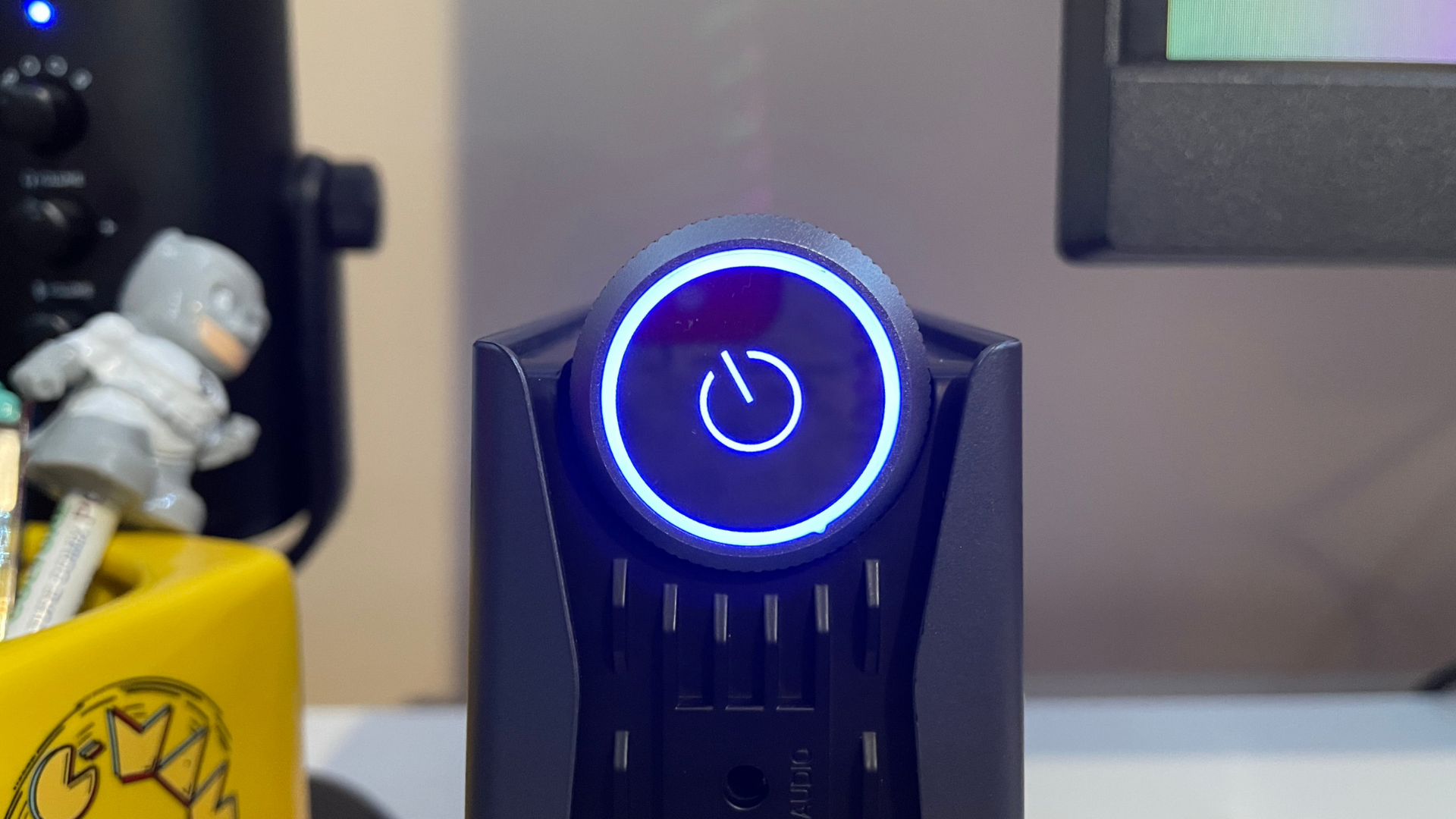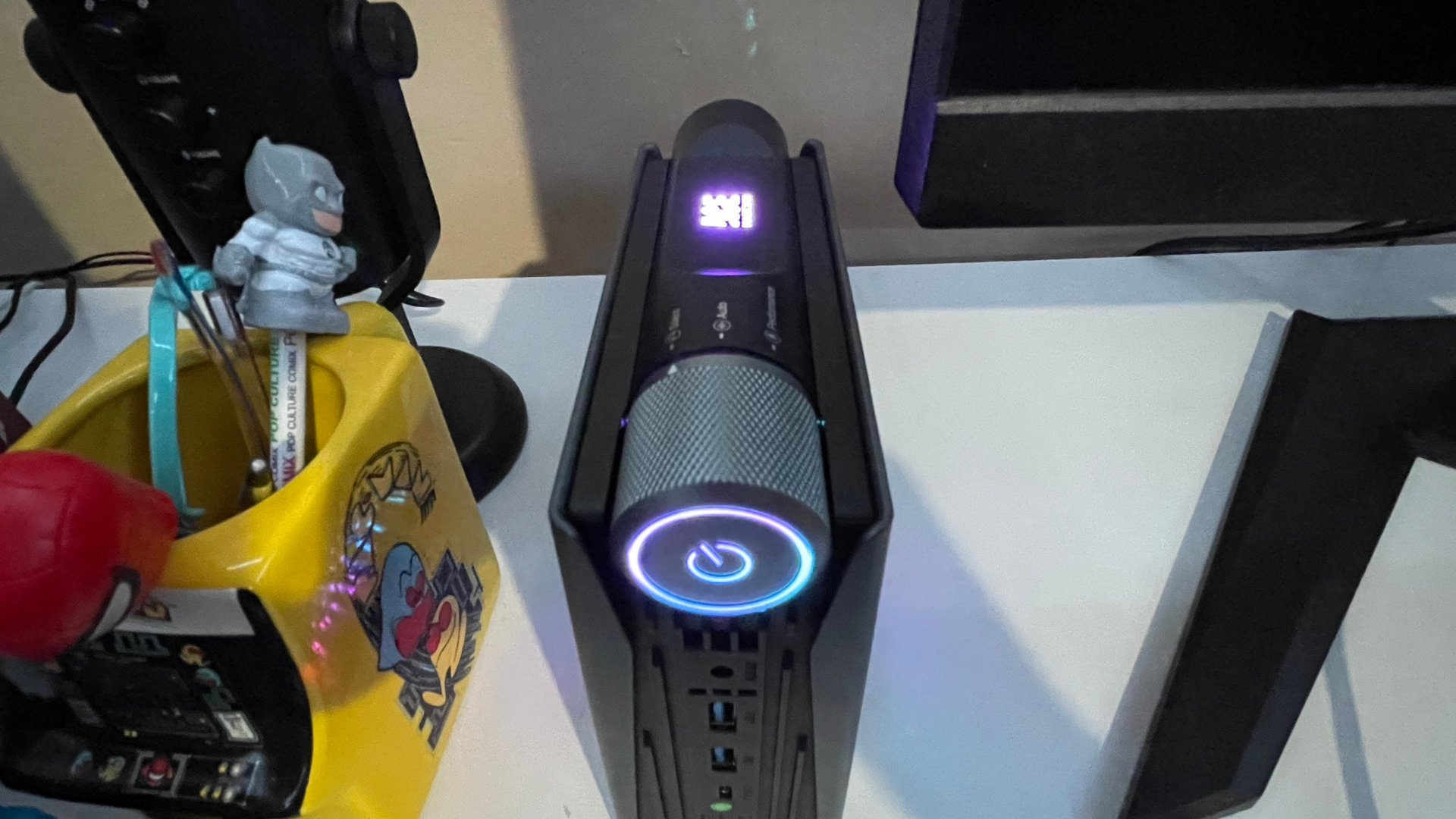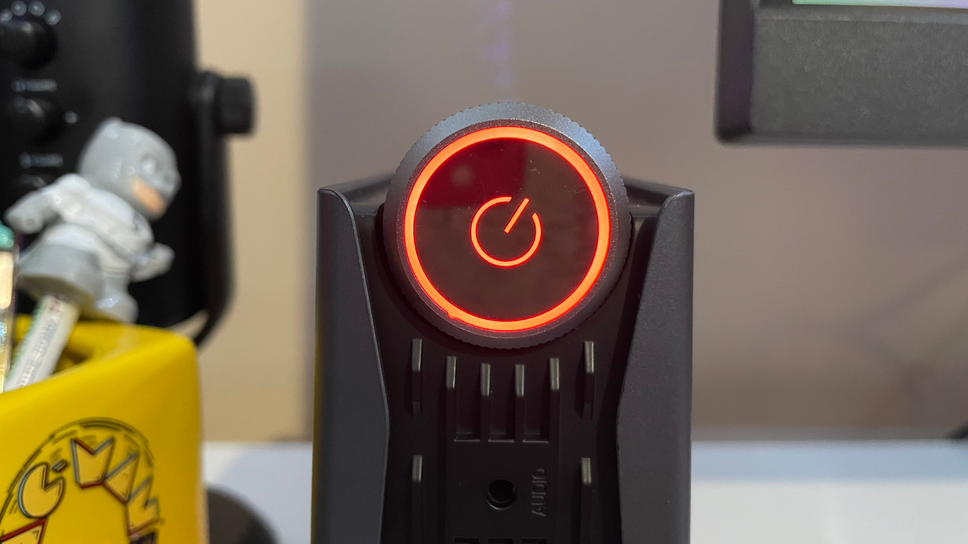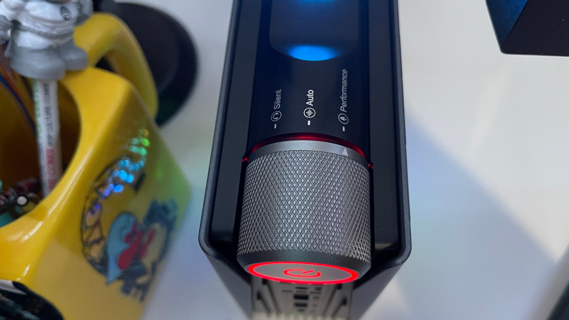 The power button and performance dial are on the system's top and towards the front. This is unique as users can alter the amount of power consumption from the AMR5 on the fly between three different settings: Silent ECO MODE, AUTO MODE, and Performance MODE. Each is also distinguished by color on the system. In Silent mode, the power button glows blue, Auto mode glows green, and Performance mode glows red.