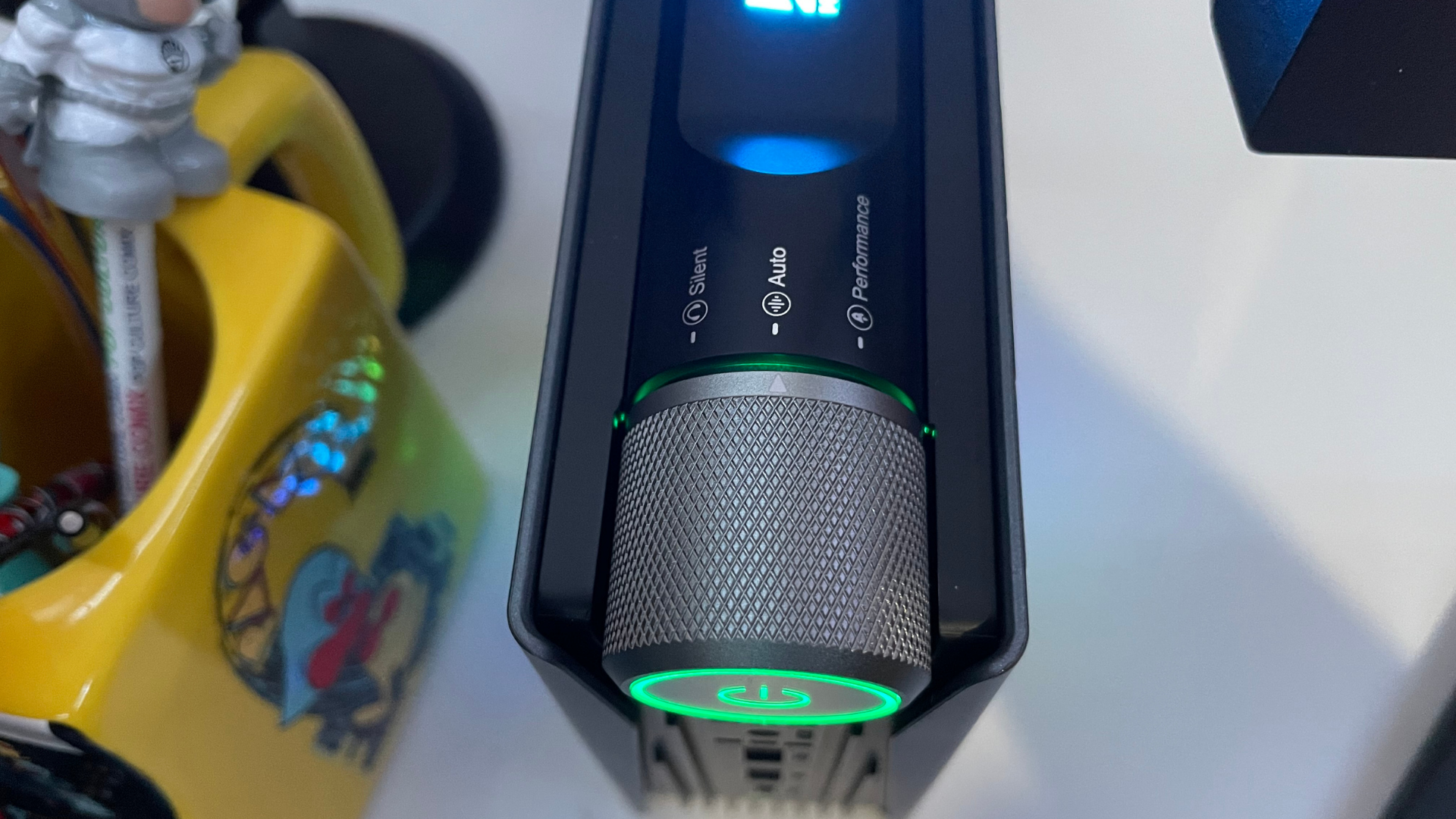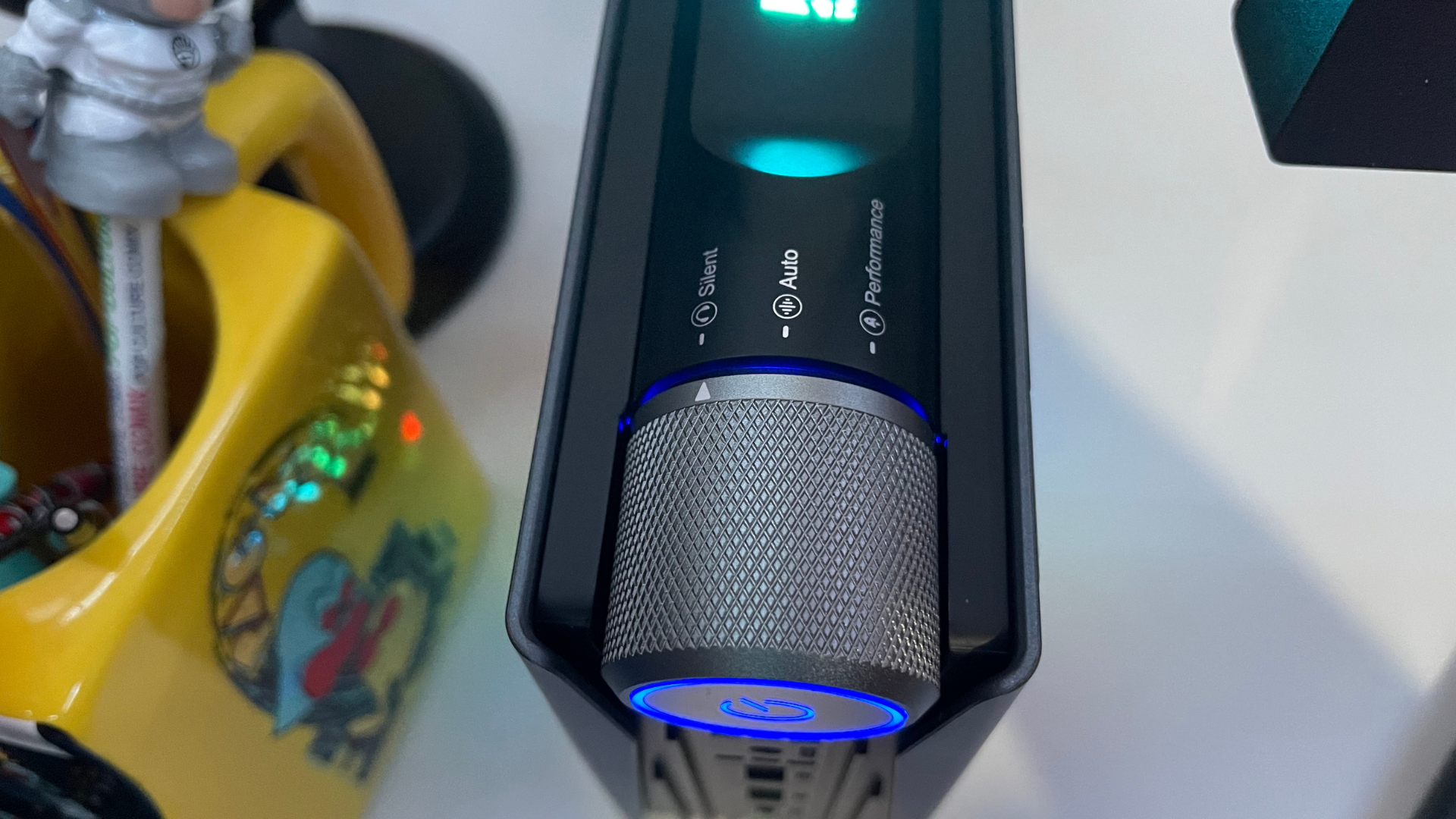 As mentioned earlier, the mode dial on the top has three options, so let us dive into what each mode offers users. Silent mode is slated to provide power consumption levels of 10 to 15 watts with a fan speed of 2500 RPM. They suggest this for everyday use, such as web browsing or streaming movies or other content. This mode ensures it will produce the least amount of temperatures compared to the alternatives. Auto Mode increases the power consumption to between 15 to 20 watts and a fan speed of 3000 RPM. This mode the company recommends if you plan on working on office tasks or multitasking processes. Performance Mode is the highest setting, increasing power consumption to 20 to 25 watts and a fan speed of 4200 RPM, which they promise will increase frame rates in gaming and assist the processor with graphics-heavy tasks.
