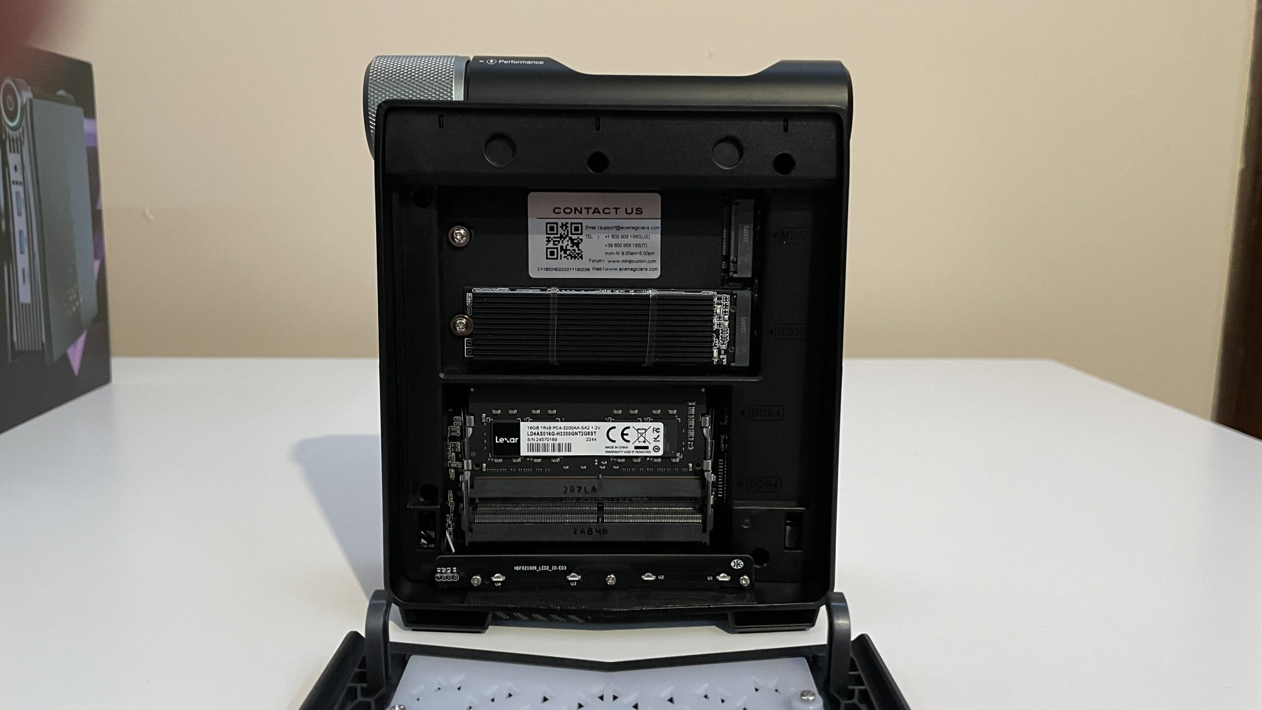 On the right side of the case is a removable shield to protect the internal memory, and magnets hold onto it for easy access. The single Lexar DDR4-2666 SODIMM memory is held in its pre-designed slot, while the 512GB M.2-2280 SATA SSD is screwed into place and surrounded by two clear bands. I have not seen this in other Mini-PCs and wonder if that could be an issue over time. Users can upgrade their memory and storage to 2 x M.2 2280 NVME/NGFF 2TB SSDs to equal 4TB of storage space and 2 x SODIMM 32 GB DDR4 memory to increase to 64 GB of RAM.