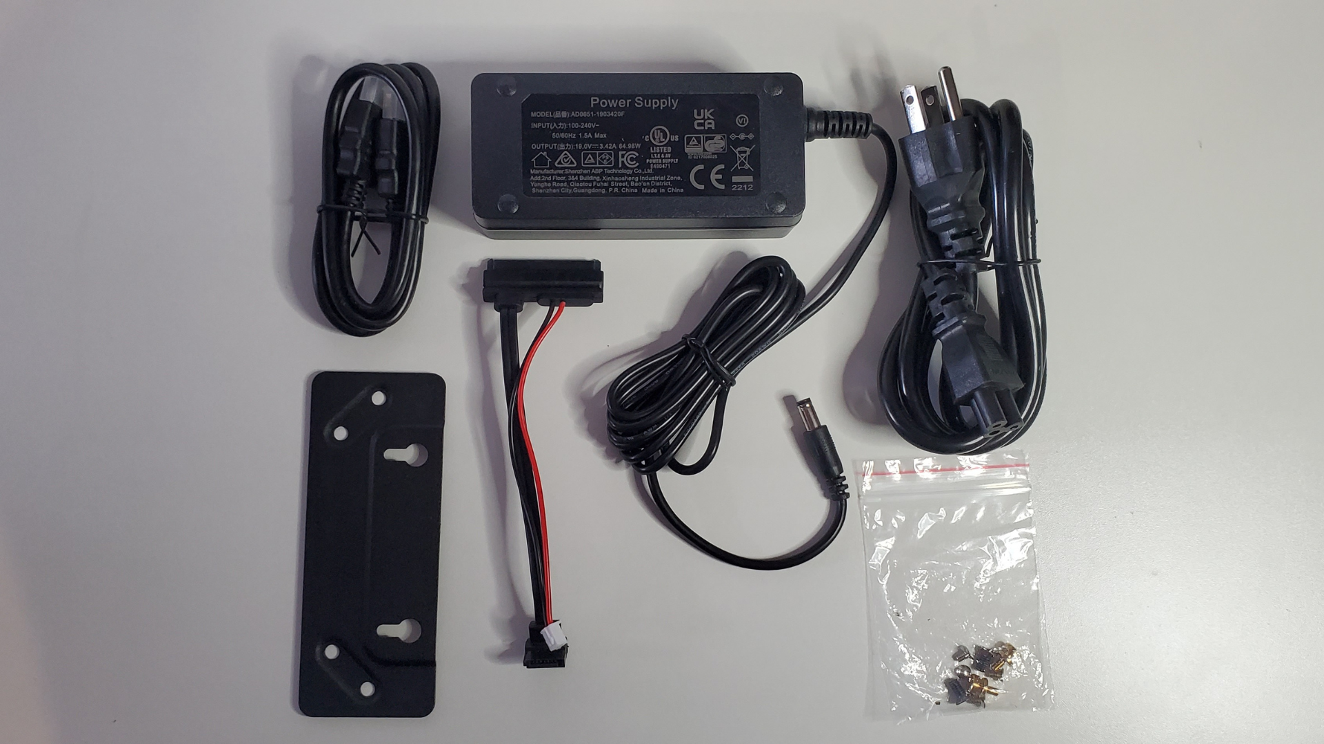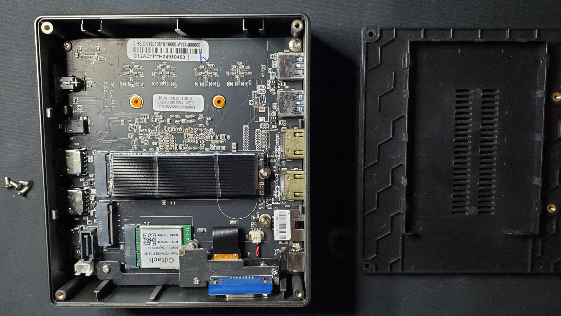Removing the bottom of the Ace Magician CK10, we can see the motherboard with an unknown 512 M.2-2280 PCIe 3.0 compatible solid-state drive. The system can be upgraded to 2TB for the SSD storage, but the memory cannot be upgraded as it is soldered to the mobo. However, what is surprising and is not advertised is the option to add a 2.5-inch SATA drive. Ace Magician ships the additional cable and screws, and the port is available inside to attach the drive with plenty of room within the case.