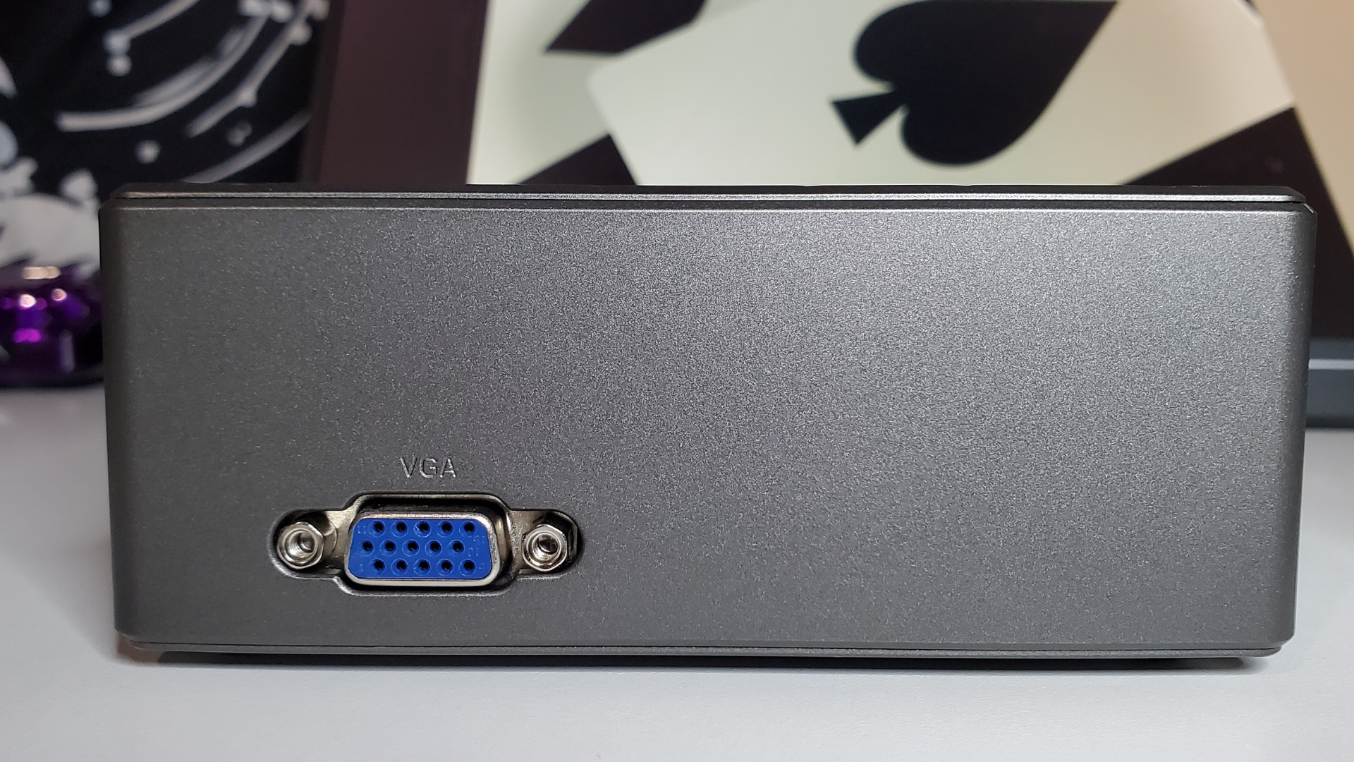 On the back of the Ace Magician CK10 Mini PC is two USB-A 3.0 ports, two HDMI 2.0 ports, an Ethernet port, and a power input port for the power source, rated at 19V. On the left side of the CK10 is a single VGA port, which is great for those still using the VGA port technology, but most likely, users will use the HDMI ports on the back.