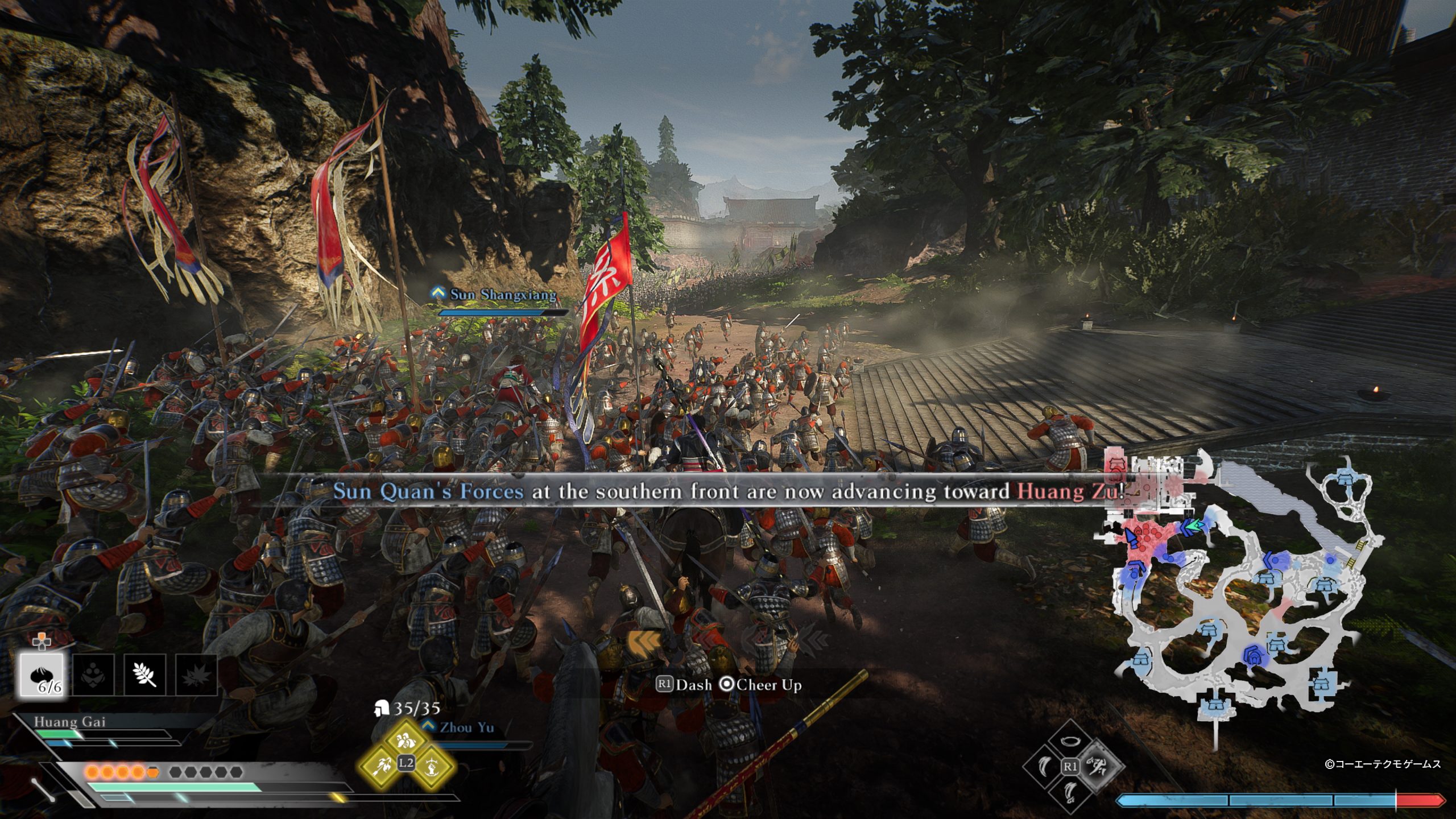 To break up the monotony and repetition of the hack-and-slash mass battles that the series is known for, Dynasty Warriors Origins gives players a few unique tools that have rarely been seen in prior titles. Midway through the story, regardless of which of the three factions Ziluan allies with, he will gain the ability to command a small squad that accompanies him as if he were a full-fledged officer. These AI units will attack on their own but can also be directly commanded via Tactics. These Tactics operate on time-based cooldowns and allow Ziluan up to three different unique abilities, such as firing a volley of flaming arrows and charging into the enemy line by horseback.