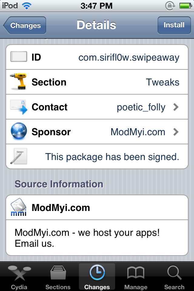 As I mentioned earlier all you need is Cydia which comes complimentary with any jailbreak. So simply open up Cydia from your homescreen and navigate to the "Search" Tab and once its open you simply type "com.sirifl0w.swipeaway" without the " ". (and yes that is a 0 and not an O as in Ostrich so be careful of that.)